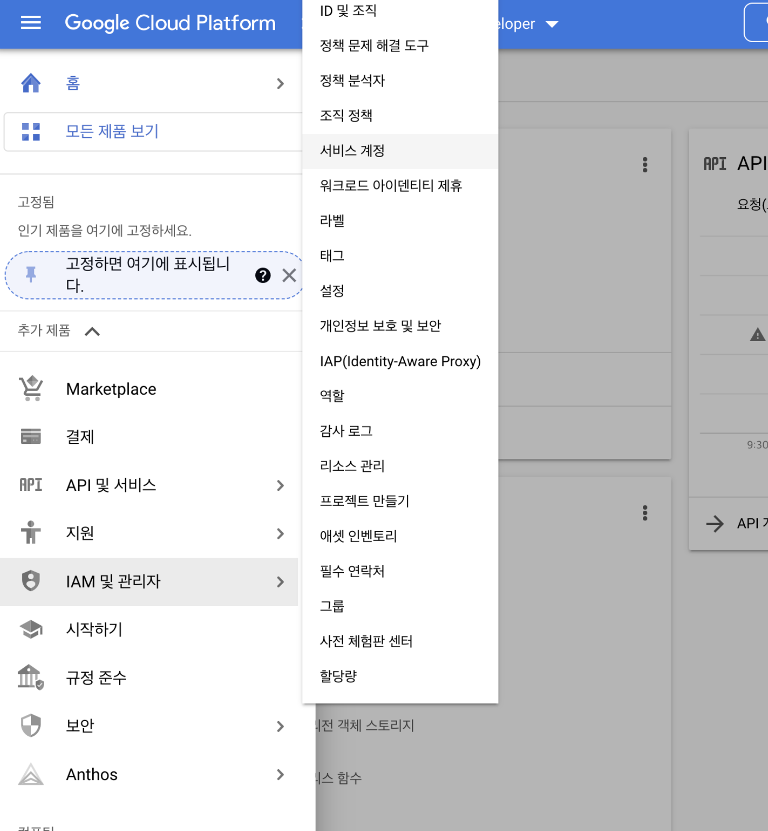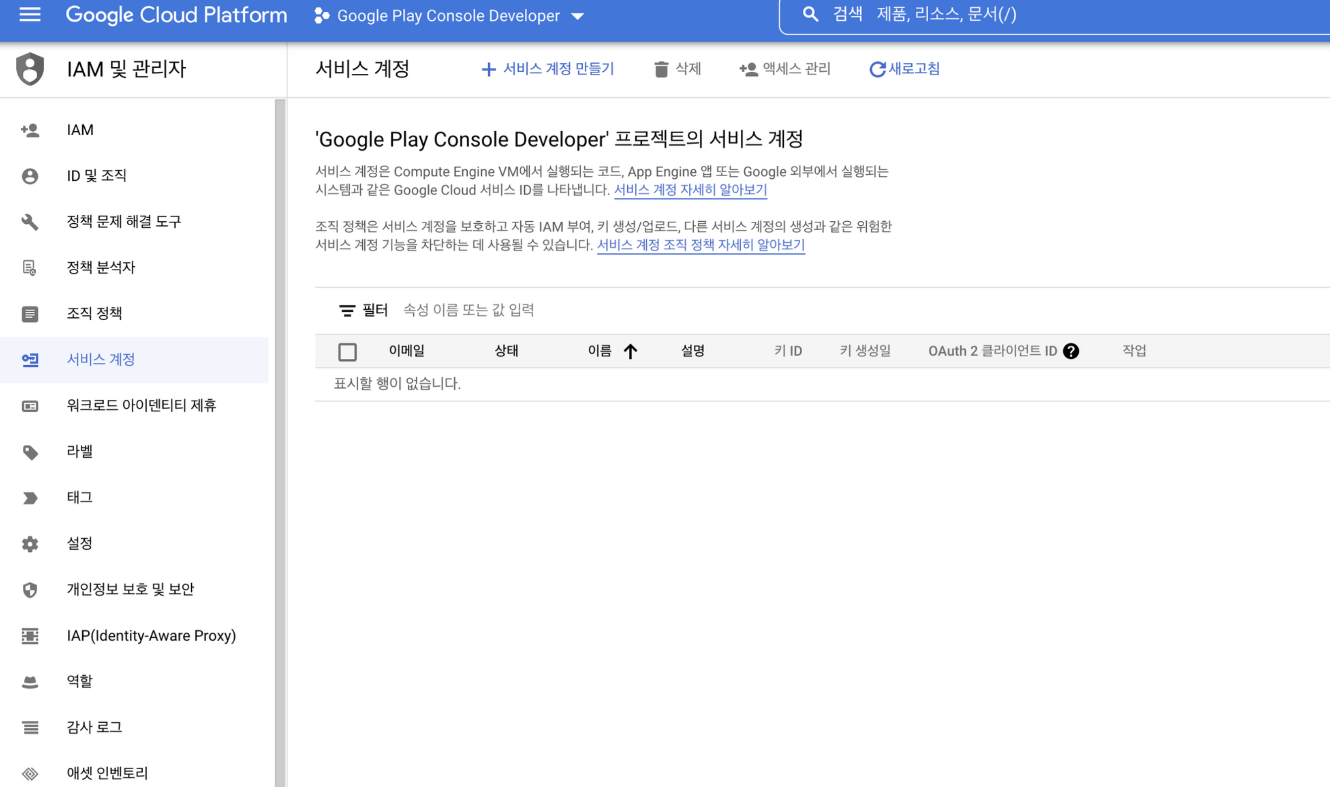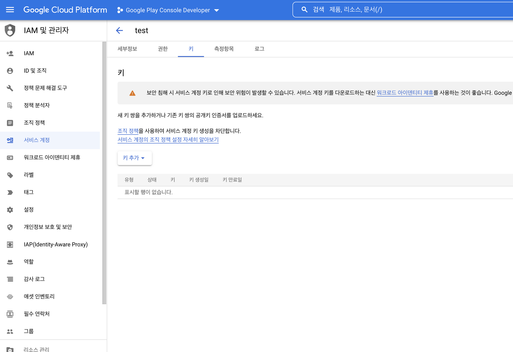 [Google Cloud ] 메뉴 - IAM 및 관리자 - 서비스 계정 선택