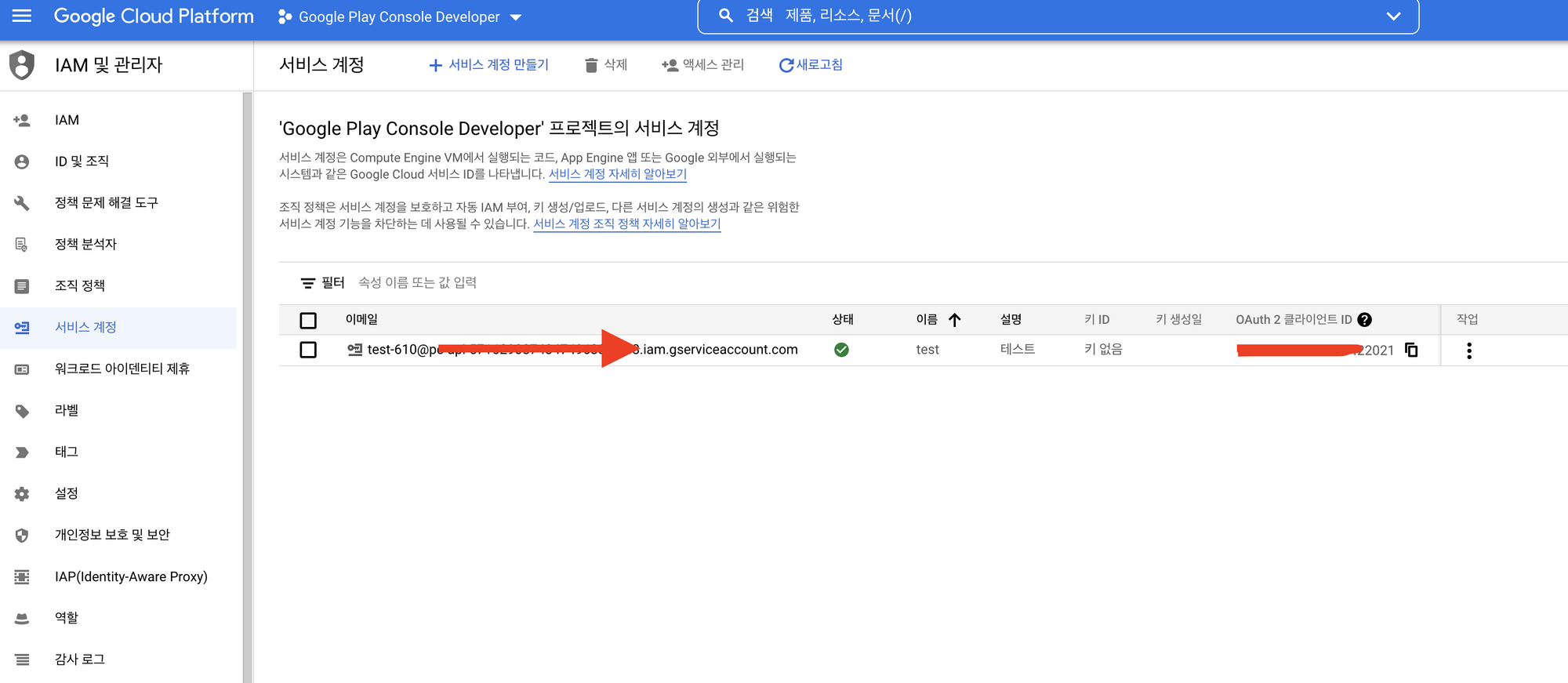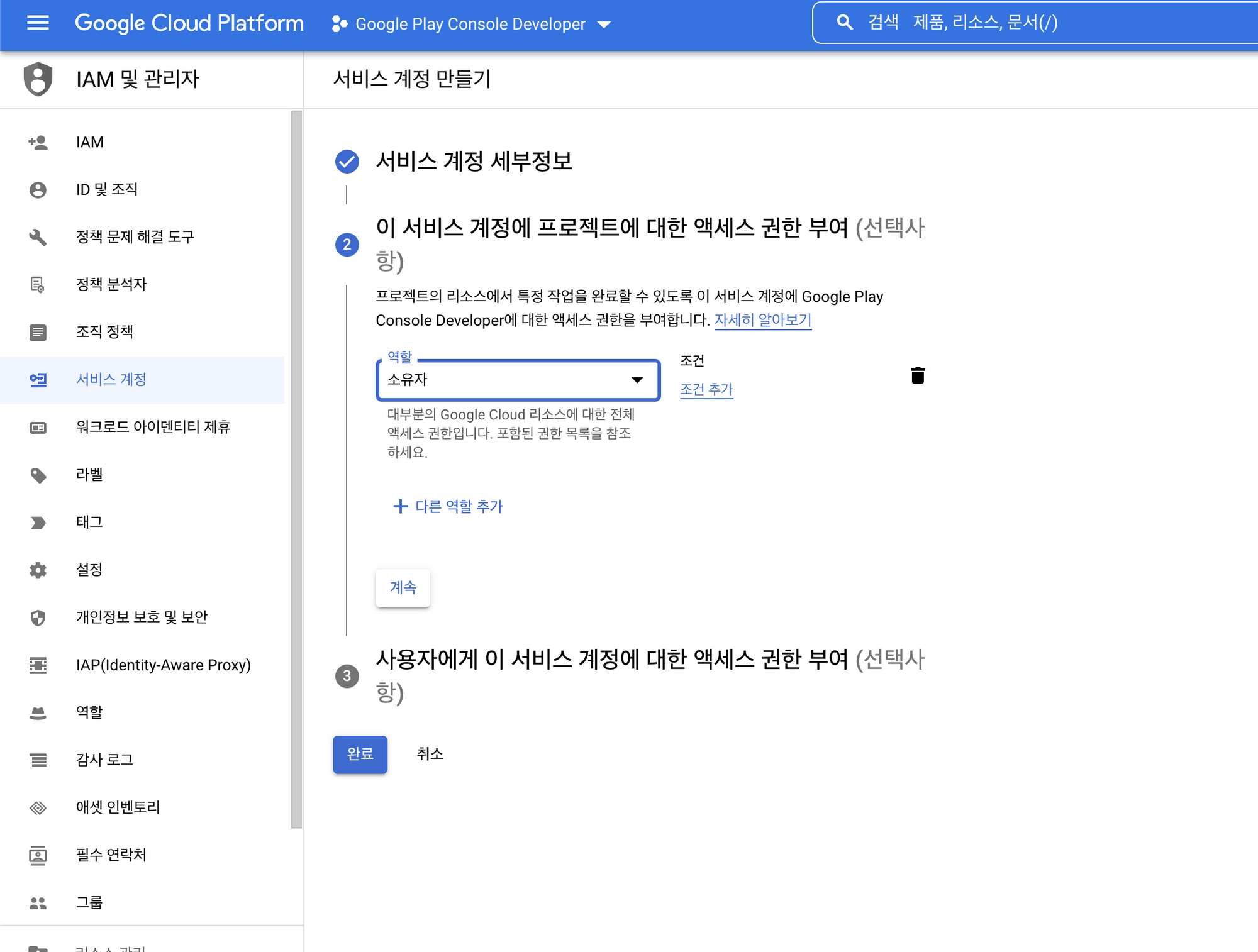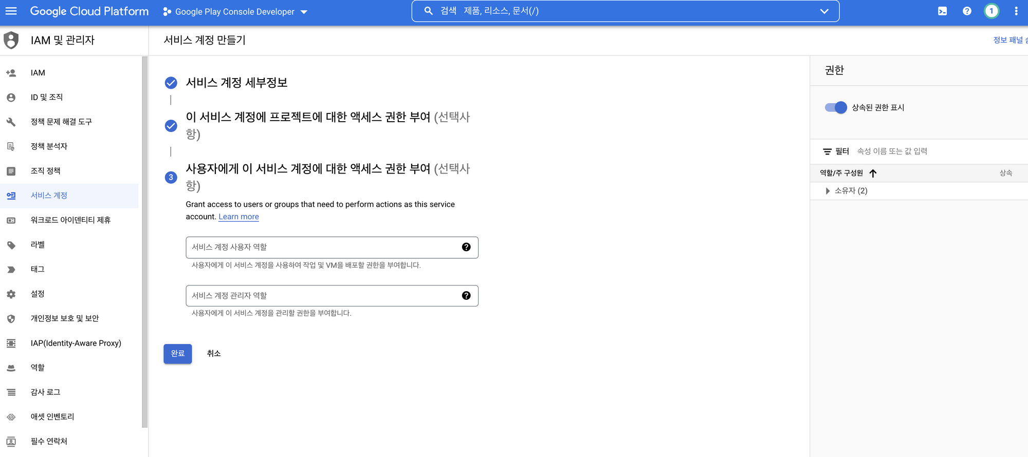 [Google Play] 서비스 계정에서 권한 부여 선택