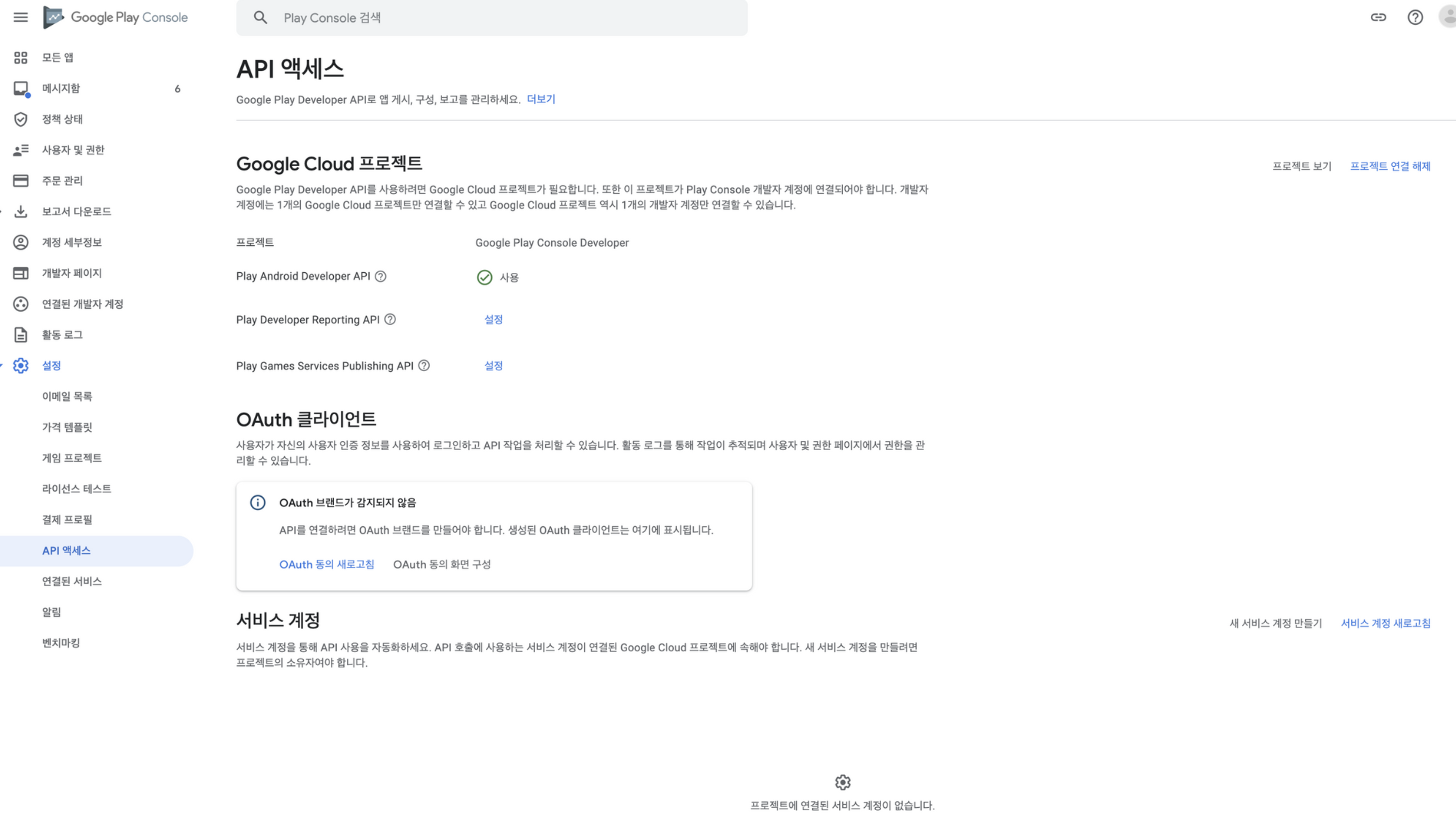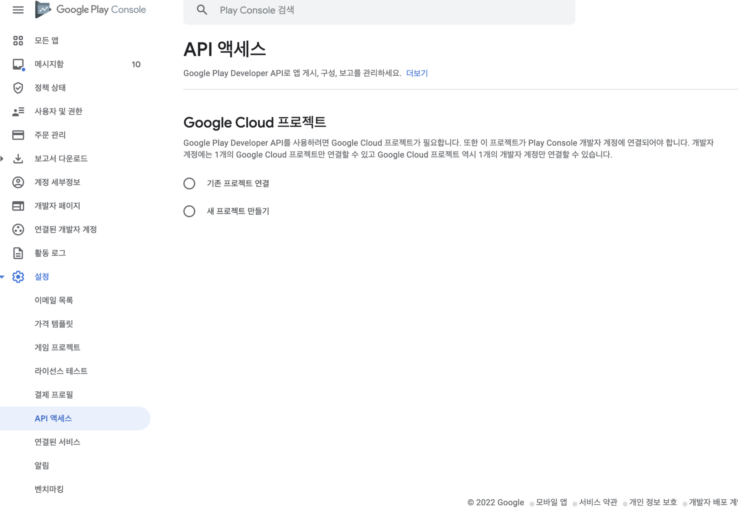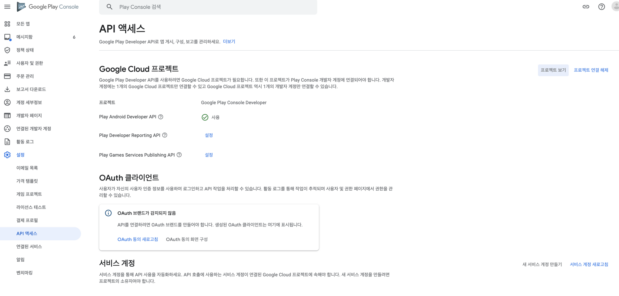 [Google Play] Google Play 콘솔 로그인 후 설정 - API 액세스 선택