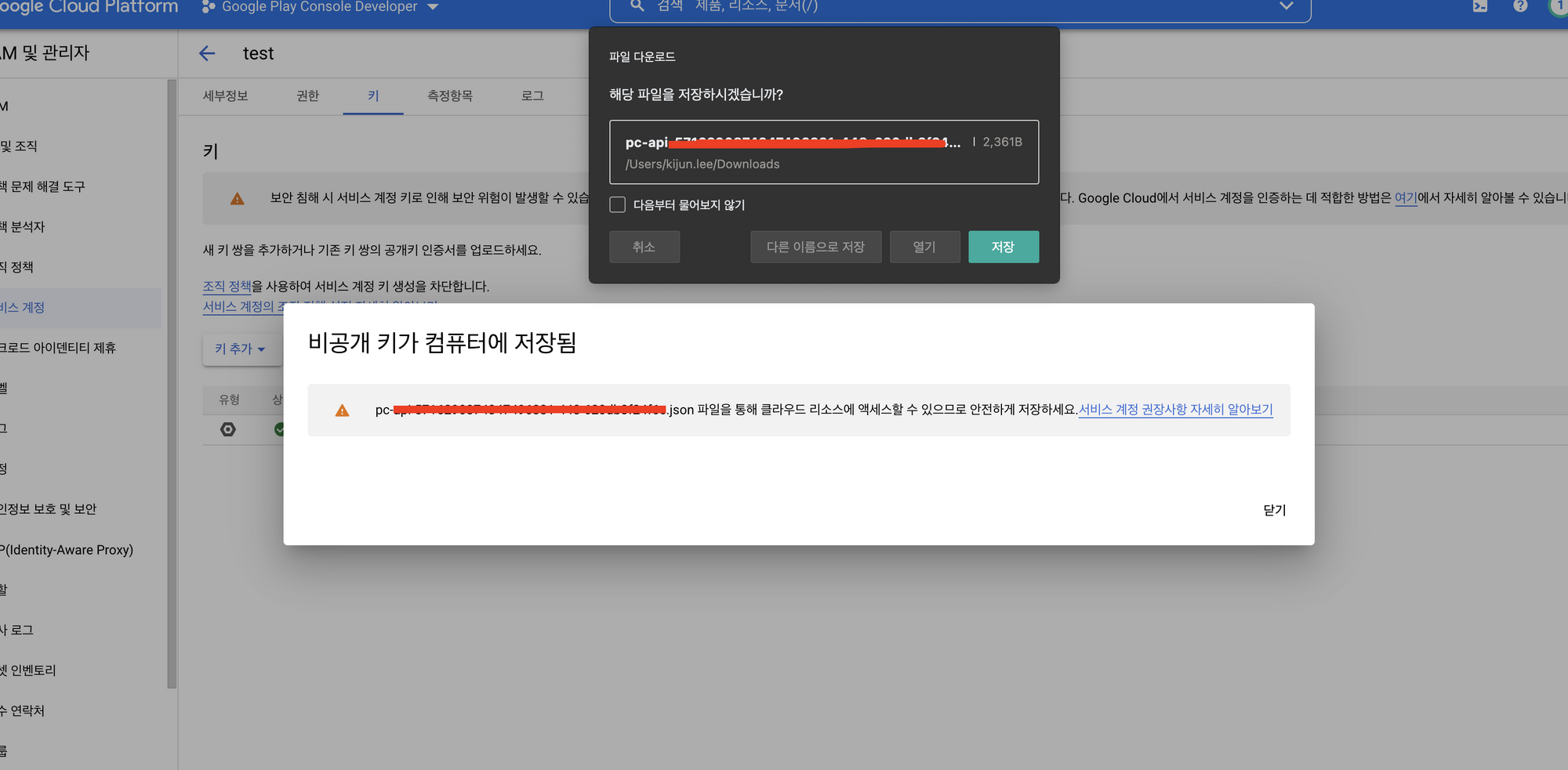 [Google Cloud Platform] 새 키 만들기 - JSON - 저장 선택하여 json 파일 저장