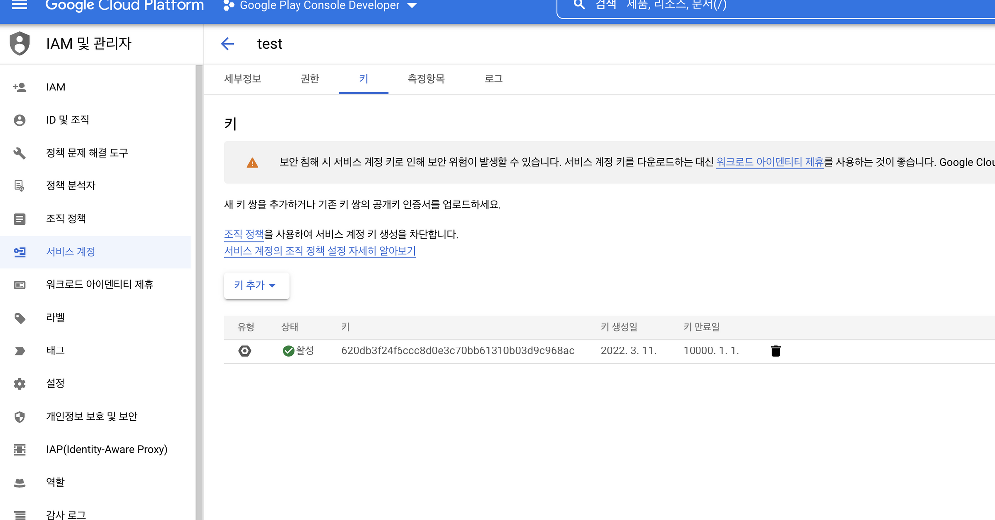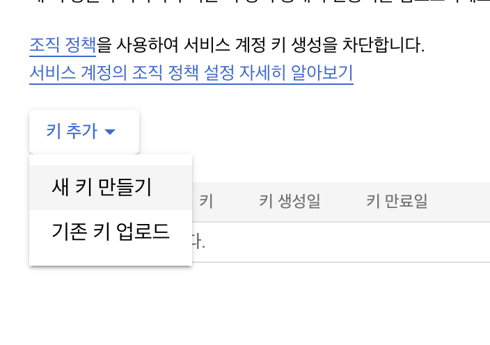 [Google Cloud Platform] 키 탭을 선택 후 키 추가 선택