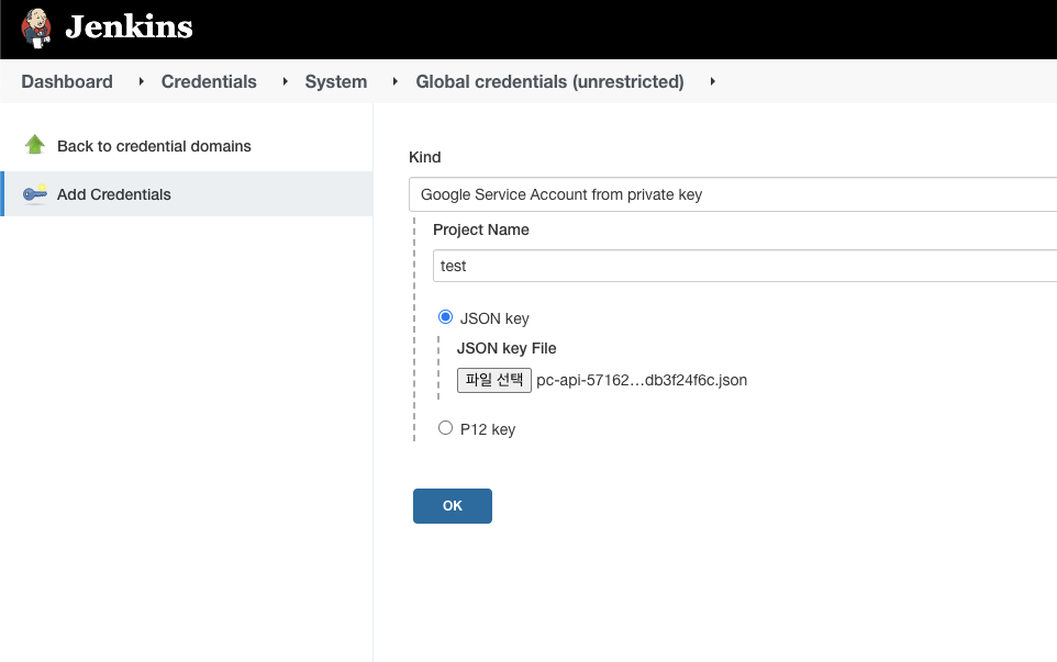[Jenkins] Project Name 기입 후 GCP에서 서비스 계정 생성시 저장한 json 파일을 선택한 후 OK 선택