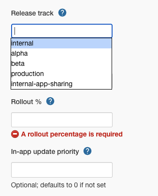 - 배포할 트랙 선택, 단계적 배포 수준, In-app Update priority 등을 설정