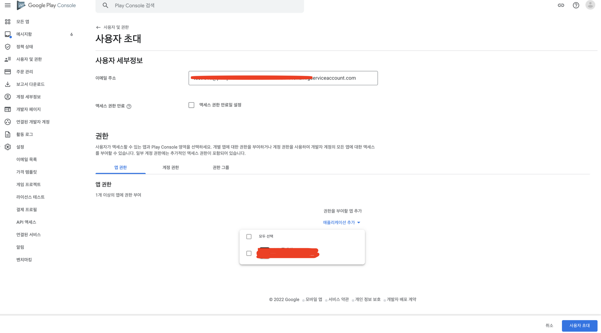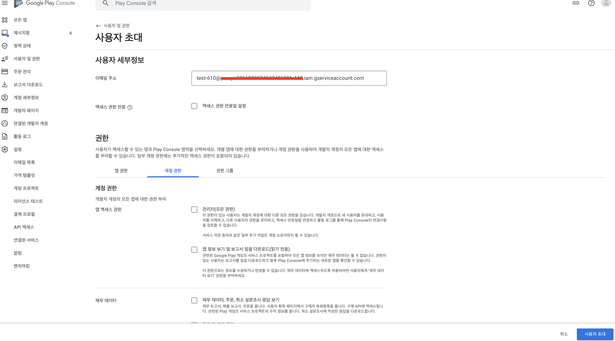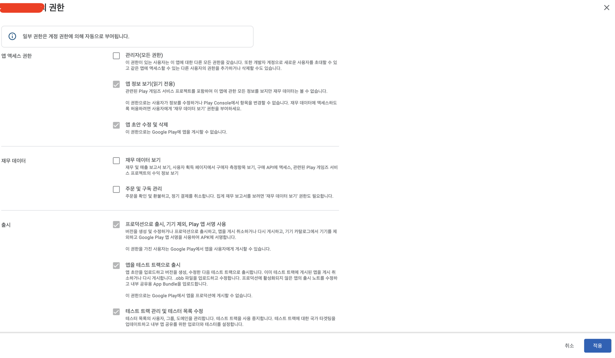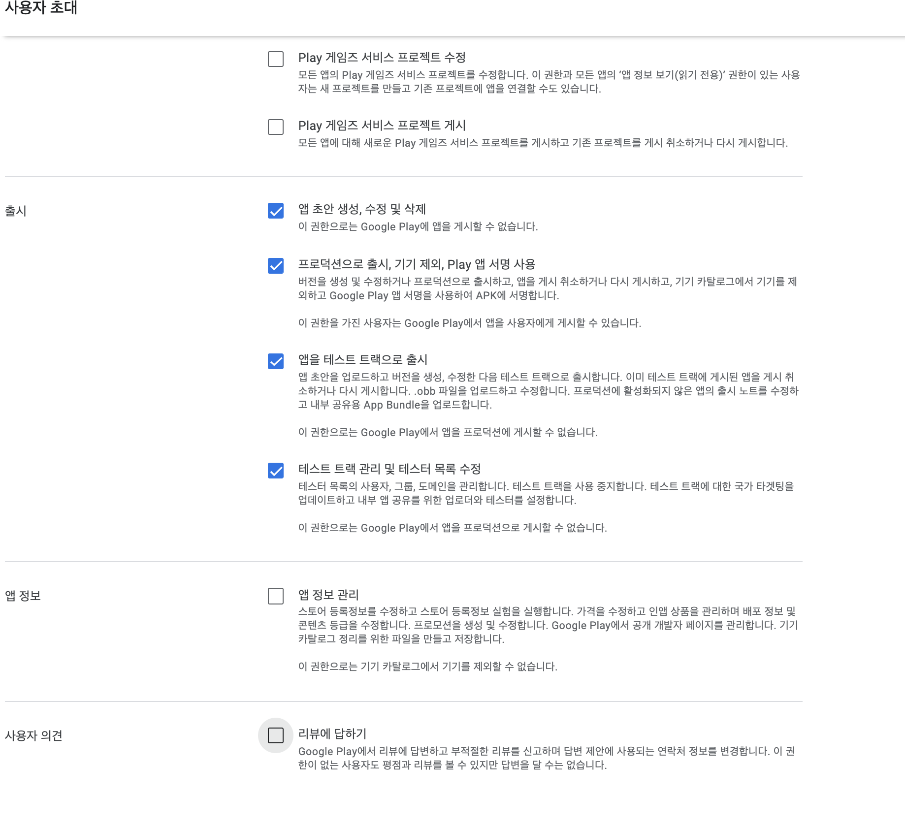 [Google Play] 사용자 초대에서 계정 권한 탭에서 출시 관련 항목들 선택