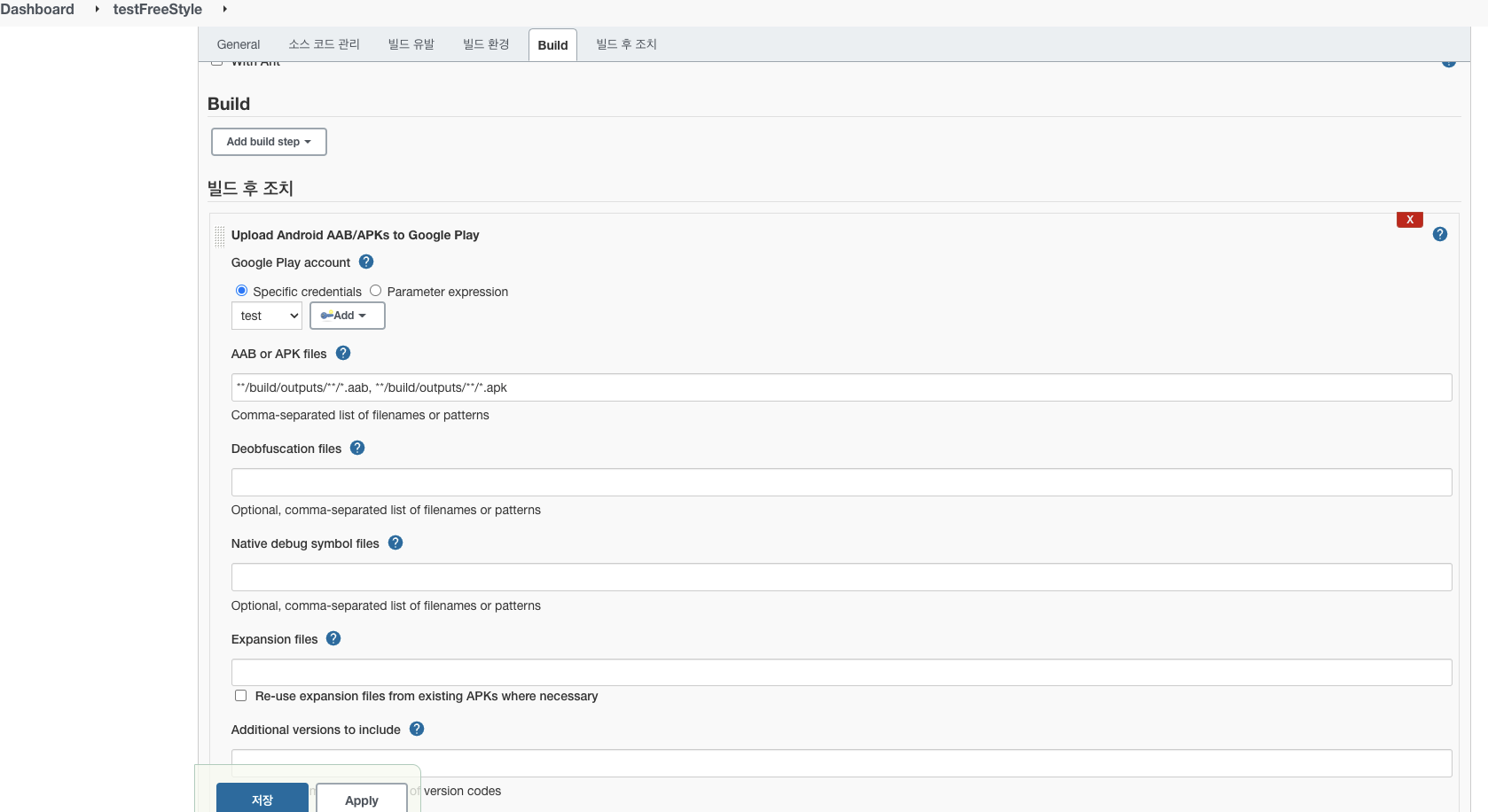 - 빌드 후 조치에 Upload Android AAB/APKs to Google Play 추가