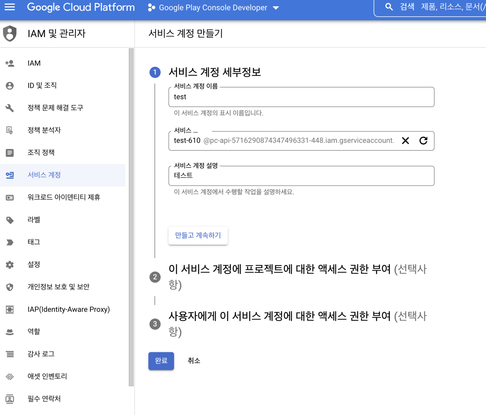 [Google Cloud Platform] 사용자에게 이 서비스 계정에 대한 액세스 권한 부여 에서는 필요시 추가 후 완료